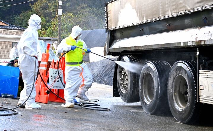 | ▲ 충북 음성군 원남면 한우농가에서 소 바이러스성 질병인 럼피스킨병(LSD)이 확진됐다. 방역 관계자들이 출입 차량을 소독하고 있다. [뉴시스] |