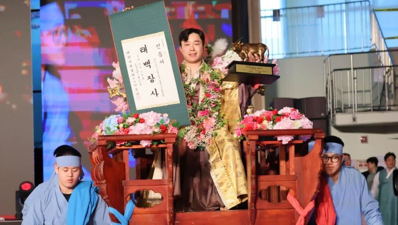 | ▲ 태안설날장사씨름대회에서 태백장사 2연패를 달성한 이광석이 꽃가마를 타고 행진하고 있다. [울주군 제공] |