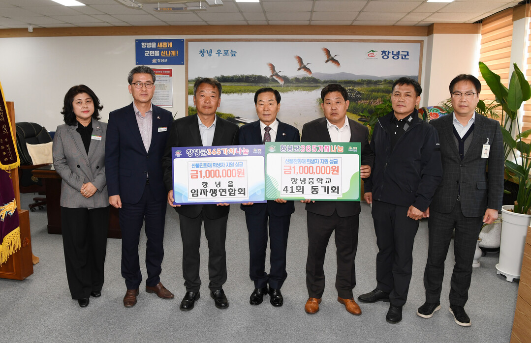| ▲ 창녕읍 임자생연합회(회장 김상헌), 창녕중학교 41회 동기회(회장 김순율) 회장단이 성낙인 군수에 성금을 기탁하고 있다. [창녕군 제공] |