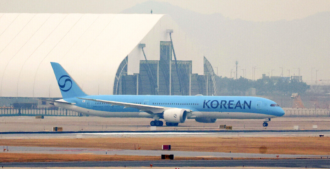 | ▲ 대한항공 새 CI 적용 항공기 KE703이 인천국제공항에서 이륙을 준비하고 있다.[뉴시스 제공] |