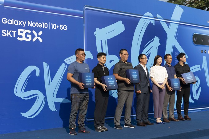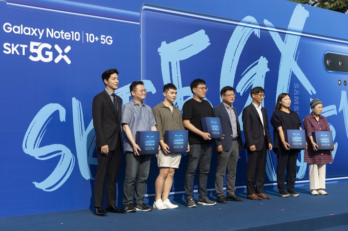 SKT 갤럭시노트10 공식 개통 행사가 20일 오전 서울 송파구 올림픽공원에서 열린 가운데 유영상 MNO 사업부장(왼쪽 네번째), 전 피겨선수 김연아, 배우 홍종현 등 참석자들이 기념촬영을 하고 있다.