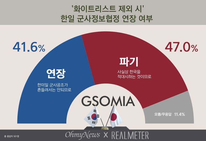 리얼미터가 오마이뉴스 의뢰로 지난 30일 전국 성인 501명을 대상으로 조사한 결과, '사실상 일본이 한국을 적대시하는 것이므로 파기해야 한다'는 응답이 47.0%, '한미일 군사공조가 흔들려서는 안되므로 연장해야 한다'는 응답은 41.6%로 나타났다.