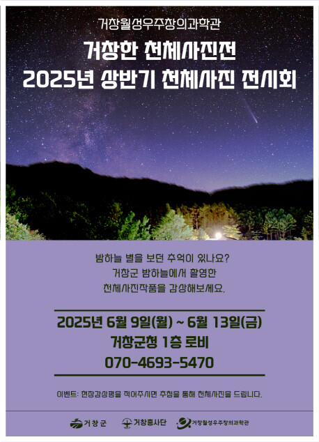 은하·혜성·은하수 등 다양한 천체를 담은 작품들을 통해 관람객들은 우주에 대한 호기심을 자극받고, 별과 자연이 어우러진 거창의 풍경을 새롭게 바라보는 경험을 할 수 있을 것으로 기대된다.