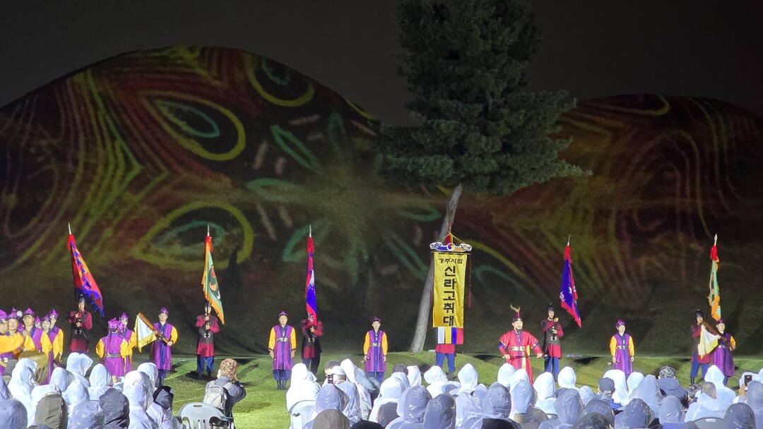 | ▲ 지난 24일 '2025 국가유산 미디어아트 경주 대릉원' 현장에서 경주시립신라고취대가 장엄한 연주로 분위기를 더하고 있다. [경주시 제공] |
