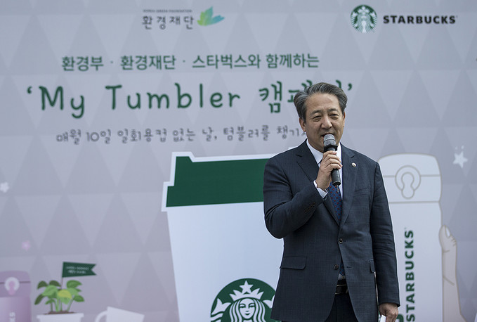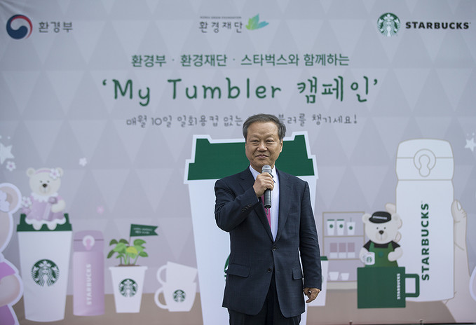 박천규 환경부 차관이 8일 오전 서울 종로구 스타벅스 더종로R점 앞에서 열린 '2019 마이 텀블러 캠페인'에서 인사말을 하고 있다.