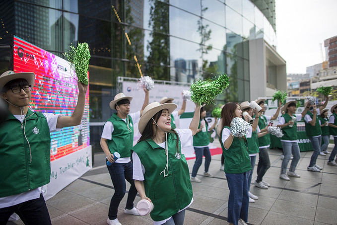 스타벅스 서포터즈들이 8일 오전 서울 종로구 스타벅스 더종로R점 앞에서 열린 '2019 마이 텀블러 캠페인'에서 플래시몹을 하고 있다.