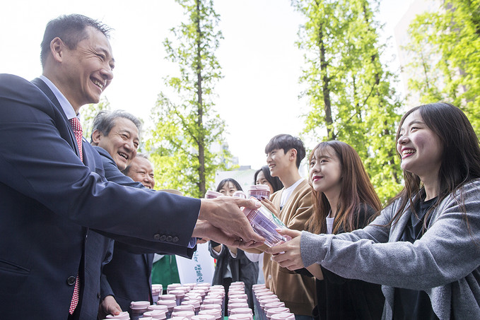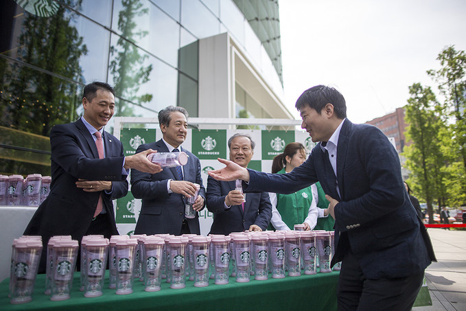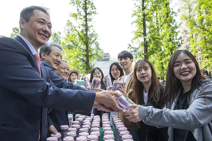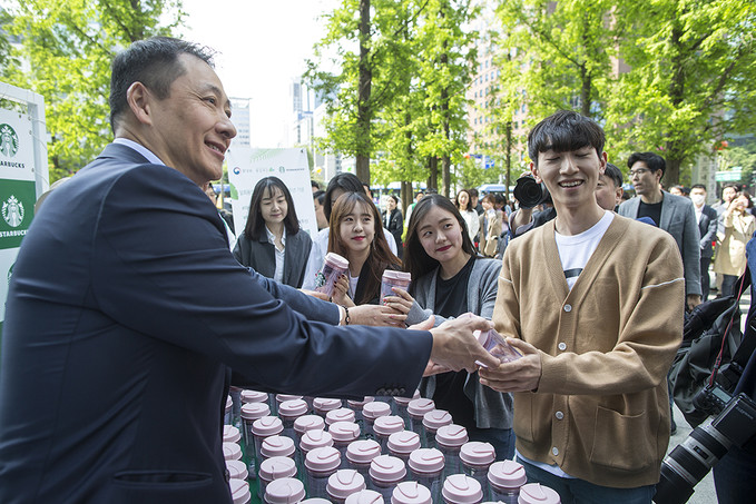 송호섭 스타벅스코리아 대표이사가 8일 오전 서울 종로구 스타벅스 더종로R점 앞에서 열린 '2019 마이 텀블러 캠페인'에서 시민들에게 텀블러를 나눠주고 있다.