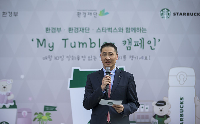 송호섭 스타벅스코리아 대표이사가 8일 오전 서울 종로구 스타벅스 더종로R점 앞에서 열린 '2019 마이 텀블러 캠페인'에서 인사말을 하고 있다.