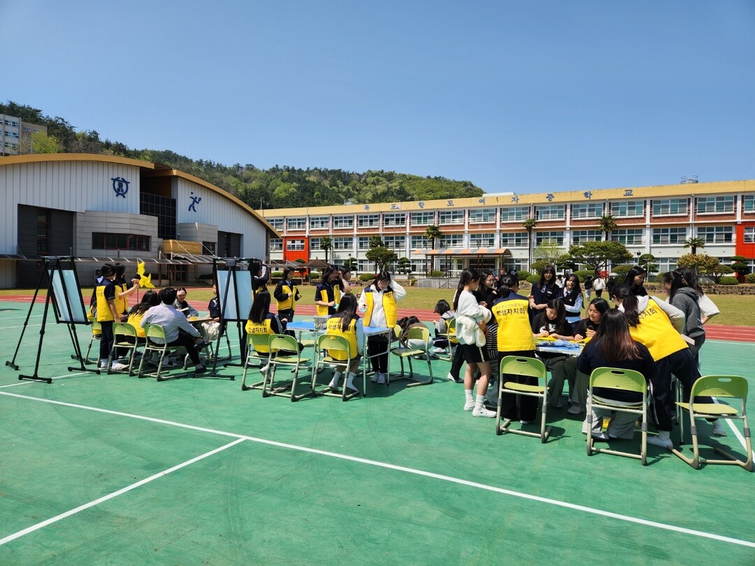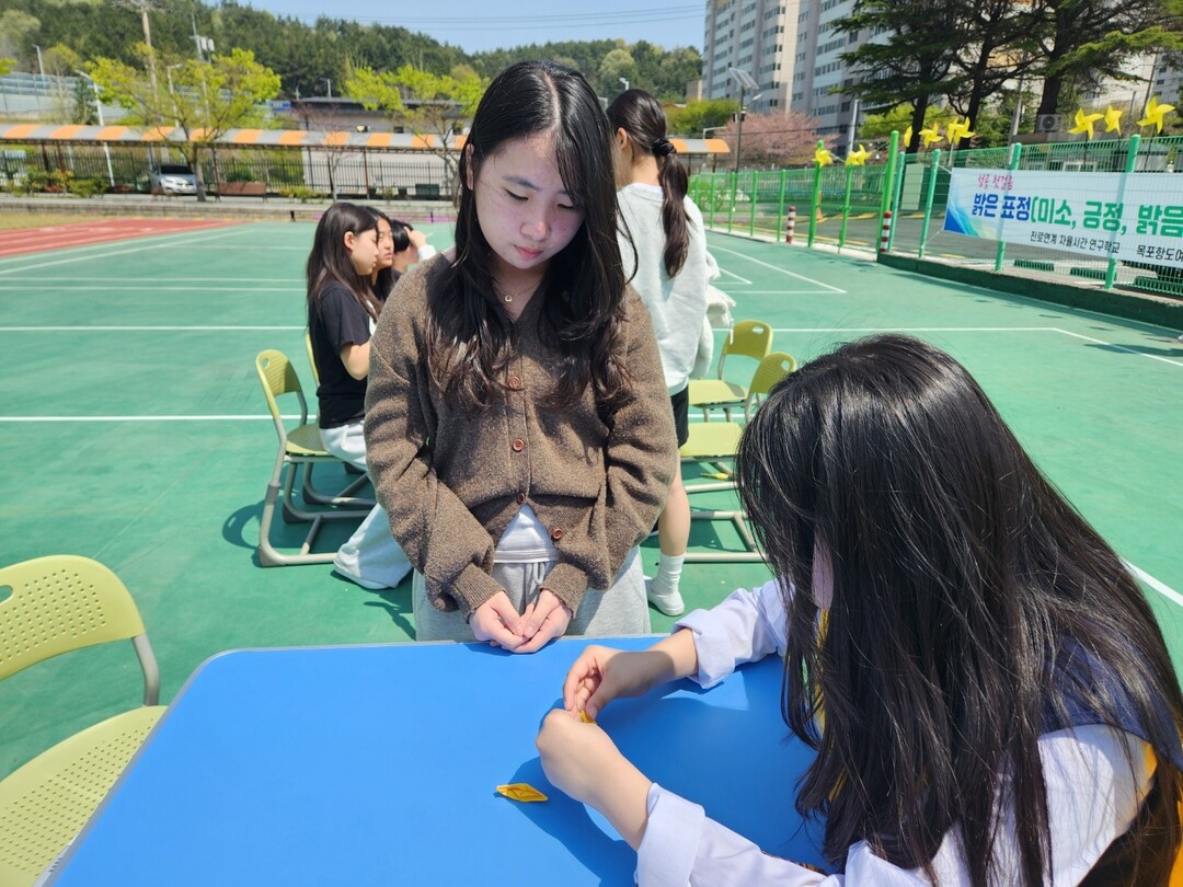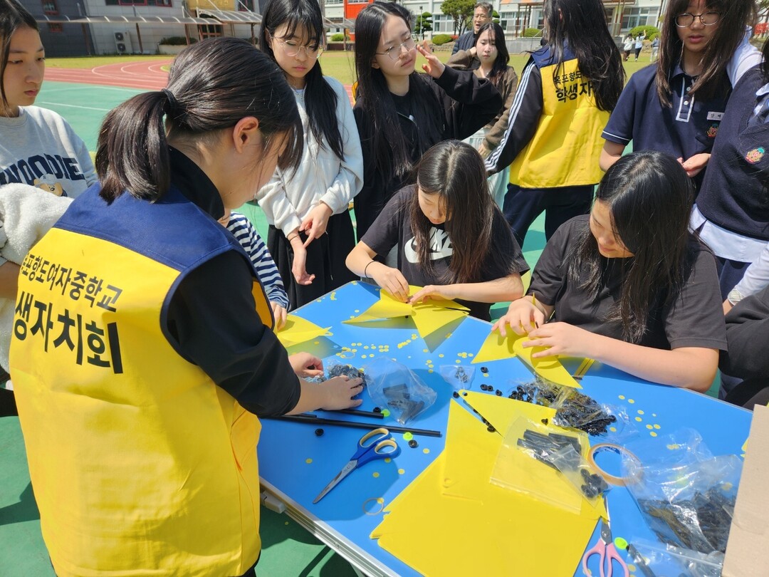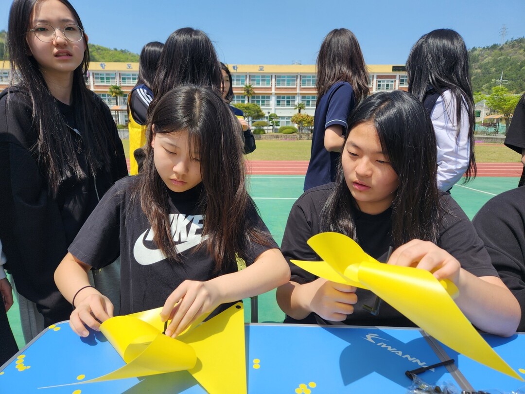 | ▲ 전남 목포항도여자중학교 학생들이 지난 15일 세월호 참사 12주기를 맞아 이를 기억하고 추모를 하기 위해 노란색 바람 개비를 손수 만들고 있다. [강성명 기자] |