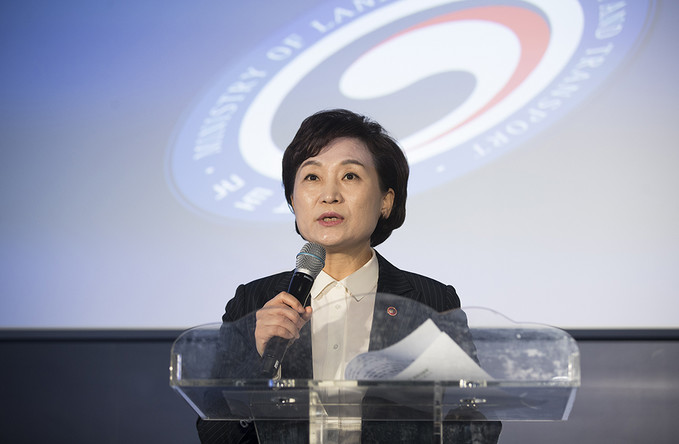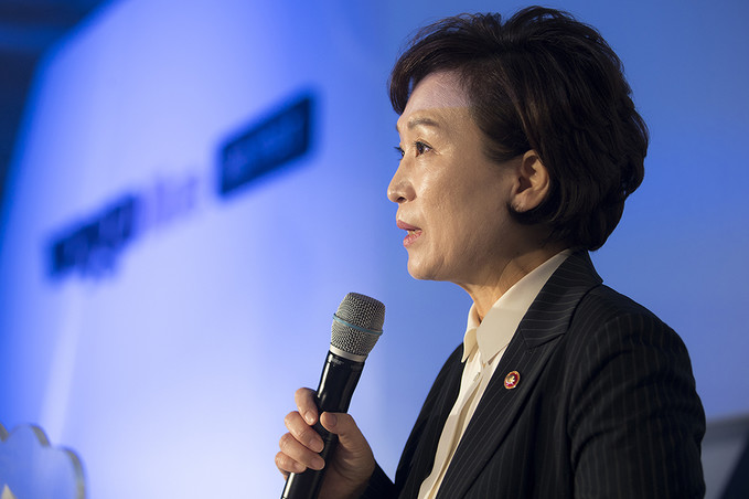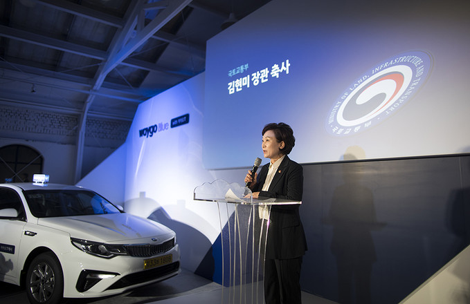김현미 국토교통부 장관이 20일 오전 서울 성동구 피어 59 스튜디오에서 열린 '웨이고 블루 with 카카오 T' 론칭 기자간담회에서 축사를 하고 있다.