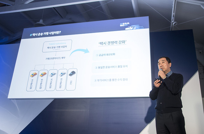 타고솔루션즈 오광원 대표가 20일 오전 서울 성동구 피어 59 스튜디오에서 열린 '웨이고 블루 with 카카오 T' 론칭 기자간담회에서 '웨이고 블루'에 대한 서비스 소개를 하고 있다.