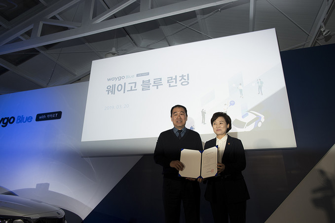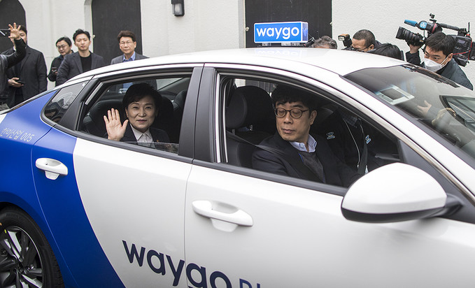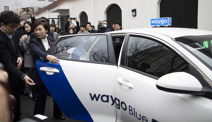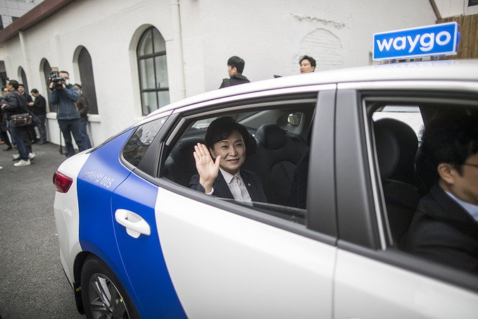 김현미 국토교통부 장관이 20일 오전 서울 성동구 피어 59 스튜디오에서 열린 '웨이고 블루 with 카카오 T' 론칭 기자간담회에서 '웨이고 블루' 차량 시승을 하고 있다.