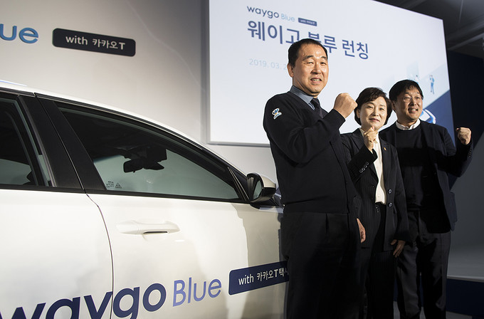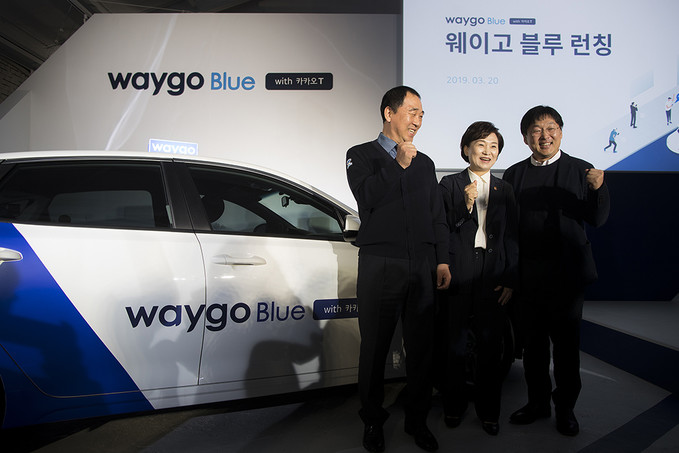 김현미 국토교통부 장관과 오광원 타고솔루션즈 대표, 정주환 카카오모빌리티 대표가 20일 오전 서울 성동구 피어 59 스튜디오에서 열린 '웨이고 블루 with 카카오 T' 론칭 기자간담회에서 기념사진을 찍고 있다.