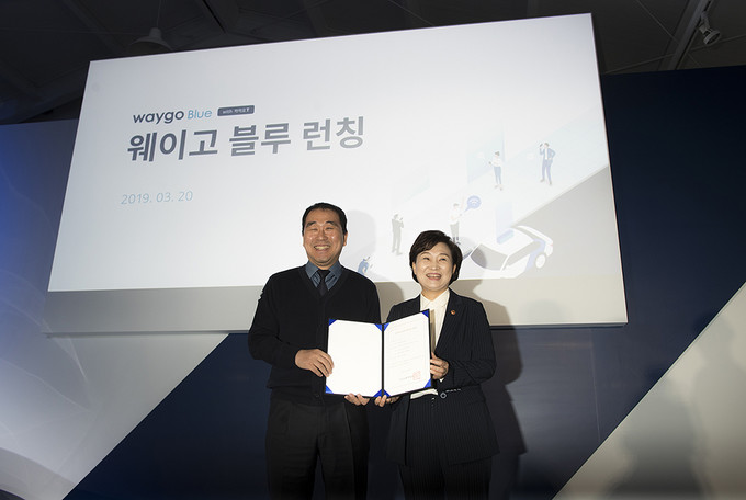 김현미 국토교통부 장관이 20일 오전 서울 성동구 피어 59 스튜디오에서 열린 '웨이고 블루 with 카카오 T' 론칭 기자간담회에서 오광원 타고솔루션즈 대표에게 면허 전달을 하고 있다.