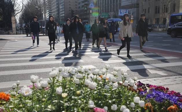 ▲ 꽃샘추위가 찾아오며 중부내륙과 전북 지역에 한파주의보가 내려진 22일 오전 서울 종로구 광화문광장 인근에서 시민들이 출근길 발걸음을 재촉하고 있다. [뉴시스]