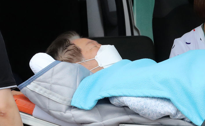 ▲ 더불어민주당 이재명 대표가 단식 19일차인 18일 서울 중랑구 녹색병원으로 이송되고 있다. [뉴시스]