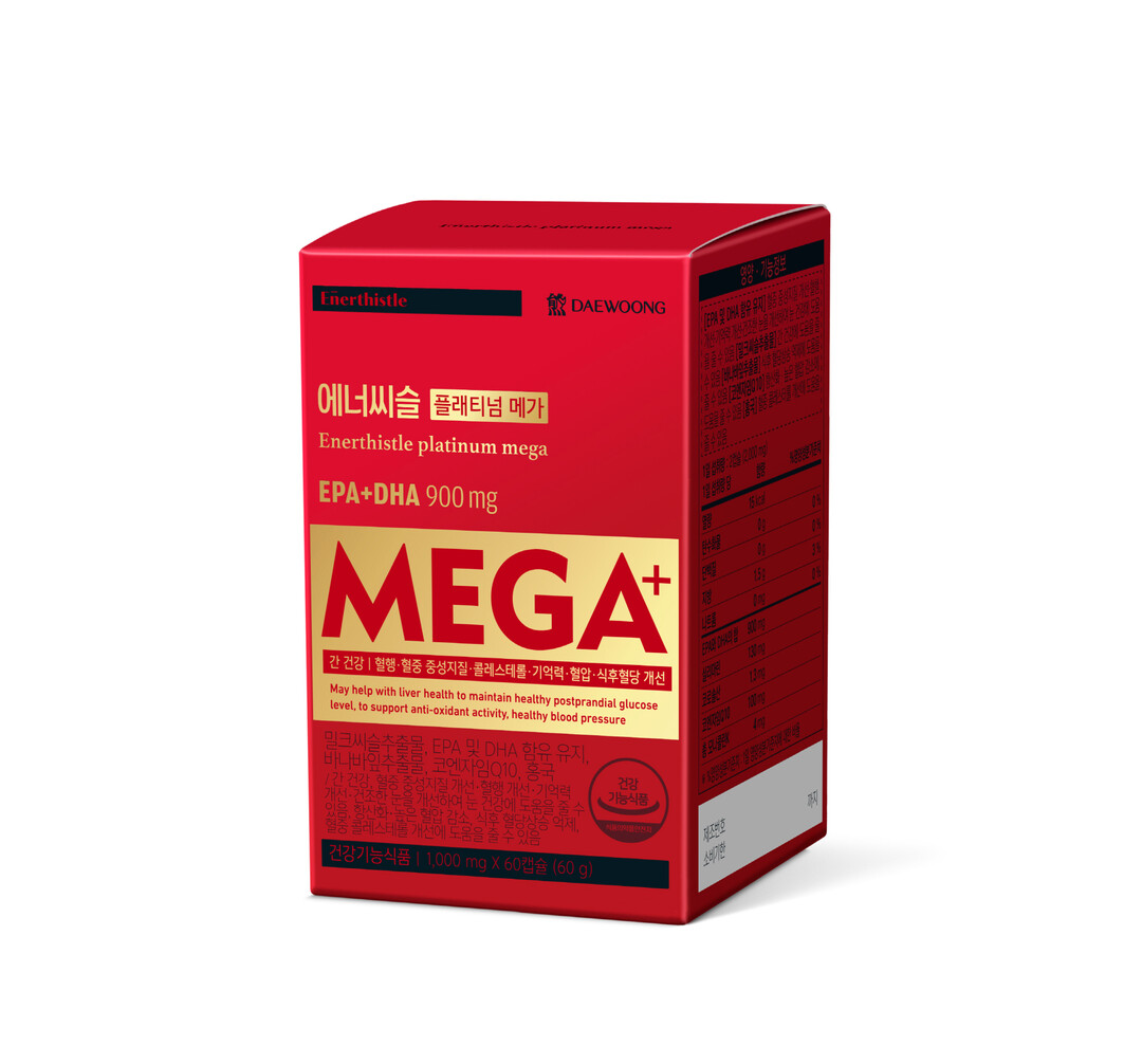 회사에 따르면 에너씨슬 플래티넘 메가는 오메가3의 주요 지방산인 EPA 및 DHA 함유 유지 총합을 900mg(일일섭취량 기준) 함유해 식약처 기준 오메가3의 네 가지 주요 기능성(혈중 중성지질, 혈행 개선, 건조한 눈 개선, 기억력 개선)을 모두 인정받았다.