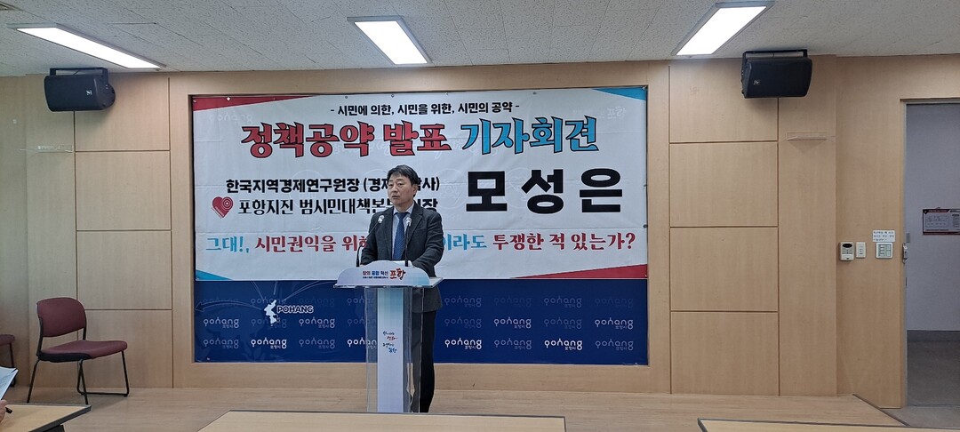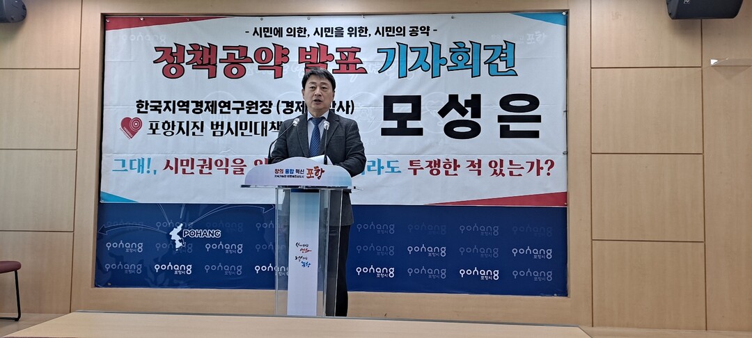모성은(포항지진범대본 의장) 포항시장 출마예정자는 14일 오전 포항시청 브리핑룸에서 기자회견을 열고, 자신의 핵심공약인 '극동 해양문화도시' 비전을 발표했다.