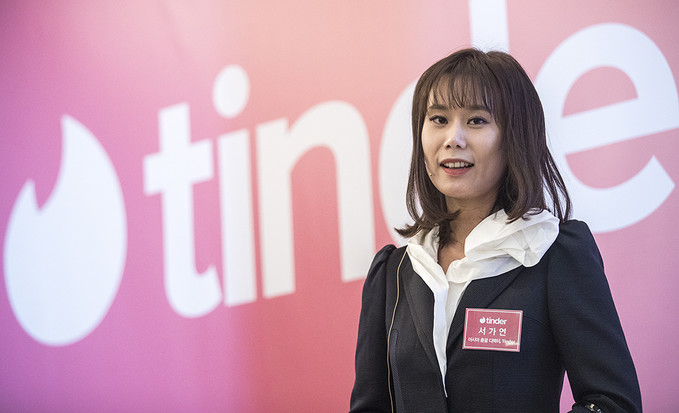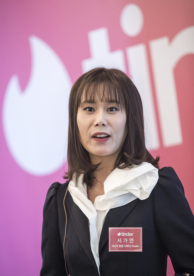 서가연 틴더 아시아 총괄 디렉터가 22일 오전 서울 중구 웨스틴 조선호텔에서 열린 내한 기자간담회에서 발표를 하고 있다.