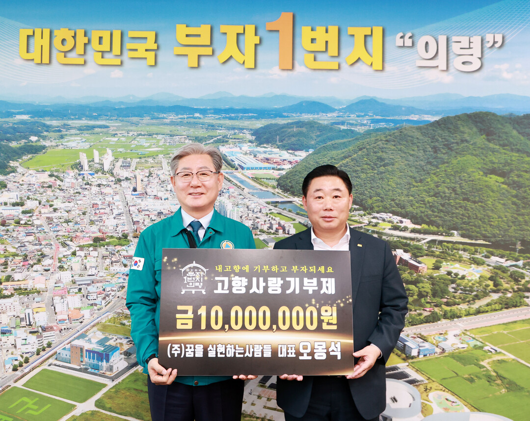 ㈜꿈을 실현하는 사람들 오몽석 대표는 지난 11일 경남 의령군청을 방문해 고향사랑기부금 1000만원을 기부했다.