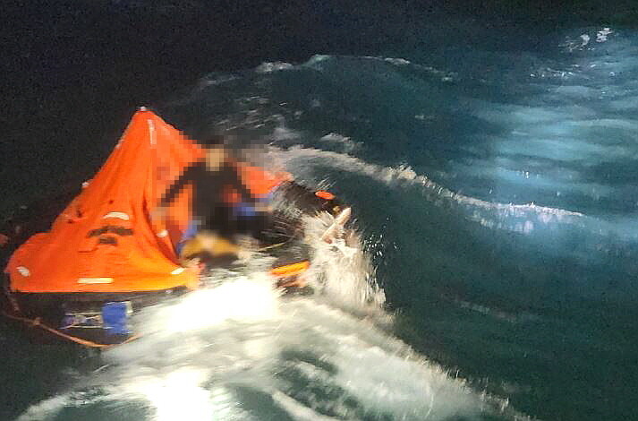 ▲ 9일 아침 여수시 삼산면 하백도 앞바다에서 대형트롤선박 침몰로 선원 1명이 구명 뗏목에서 구조를 기다리고 있는 모습 [여수해양경찰서 제공]