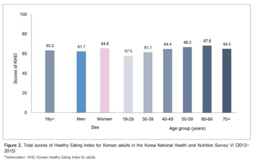 30일 질병관리본부의 '주간 건강과 질병' 52호에 따르면 국민건강영양조사 제6기(2013~2015)에 참여한 19세 이상 1만5954명(남자 6688명, 여자 9266명)을 대상으로 평가한 결과, 우리나라 성인의 식생활평가지수는 100점 만점에 63.3점이었다.
