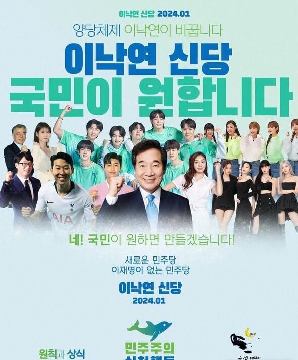 이런 가운데 최근 온라인 커뮤니티 등에서는 이 전 대표의 신당 창당을 소개하는 포스터가 돌아 논란이 일었다. 포스터에는 '국민이 원하면 만들겠다', '새로운 민주당 이재명 없는 민주당' 등의 문구와 함께 방탄소년단과 임영웅, 아이유, 유재석, 손흥민, 김연아 등 유명인들의 모습이 담겼다.
