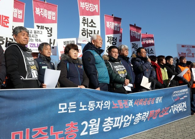 김명환 민주노총 위원장은 1일 오전 10시 서울 영등포구 국회 앞에서 기자회견을 열고 "오는 8일 각급 대표들이 모여서 국회가 개악하려는 관련 법의 통과 저지를 요구하는 2월 총력 총파업 투쟁 결의를 만들겠다"고 밝혔다.
