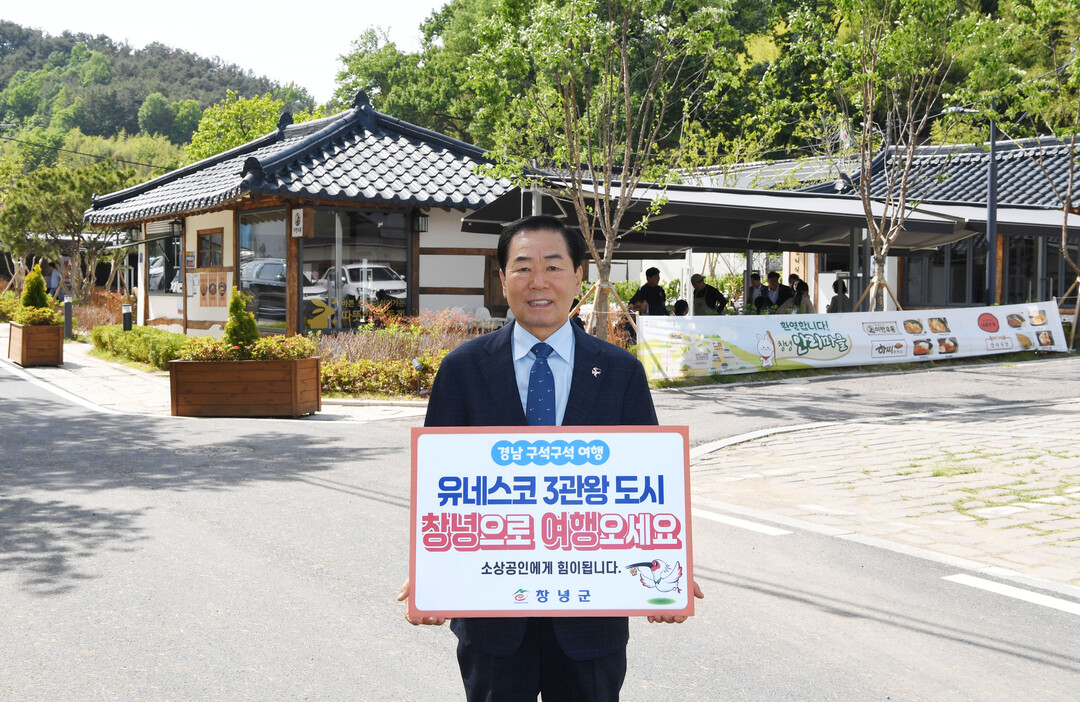 ▲ 성낙인 군수가 이방면 청년 외식 창업공간에서 '경남 구석구석 여행하기 캠페인'에 참여하며 기념촬영을 하고 있다. [창녕군 제공]