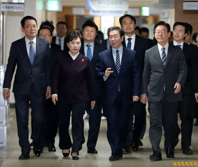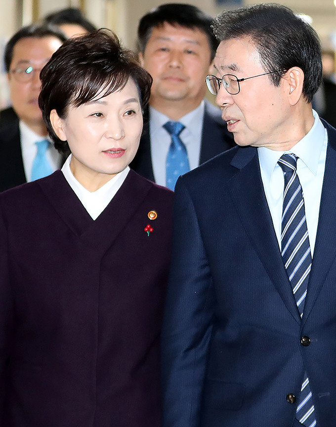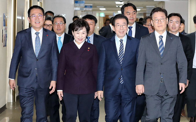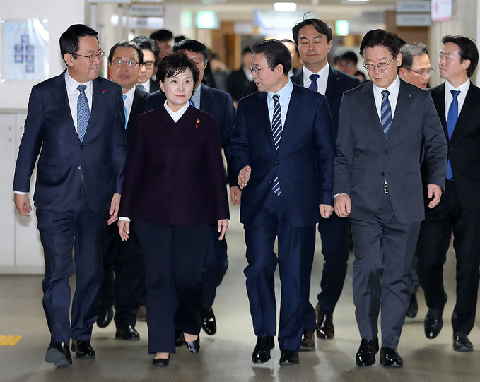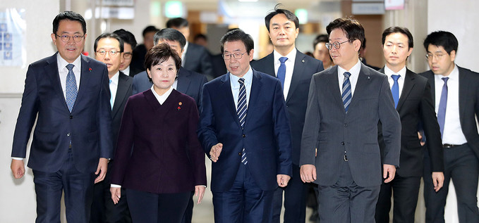 김현미(왼쪽 두번째) 국토교통부 장관 및 박원순 서울시장, 이재명 경기지사 등 관계자들이 19일 오전 서울 종로구 정부서울청사에서 수도권 3기 신도시 입지와 2기 수도권 광역교통대책 발표를 위해 브리핑룸으로 들어가고 있다.