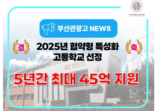 부산관광고등학교가 부산에서 유일하게 교육부의 '협약형 특성화고'에 선정됐다. 이로써 향후 5년간 최대 45억 원의 국비 지원을 받게 되는 부산관광고는 내년부터 학과 개편과 교원 연수 등을 거쳐 2026학년도 신입생부터 새 교육과정을 적용할 계획이다.