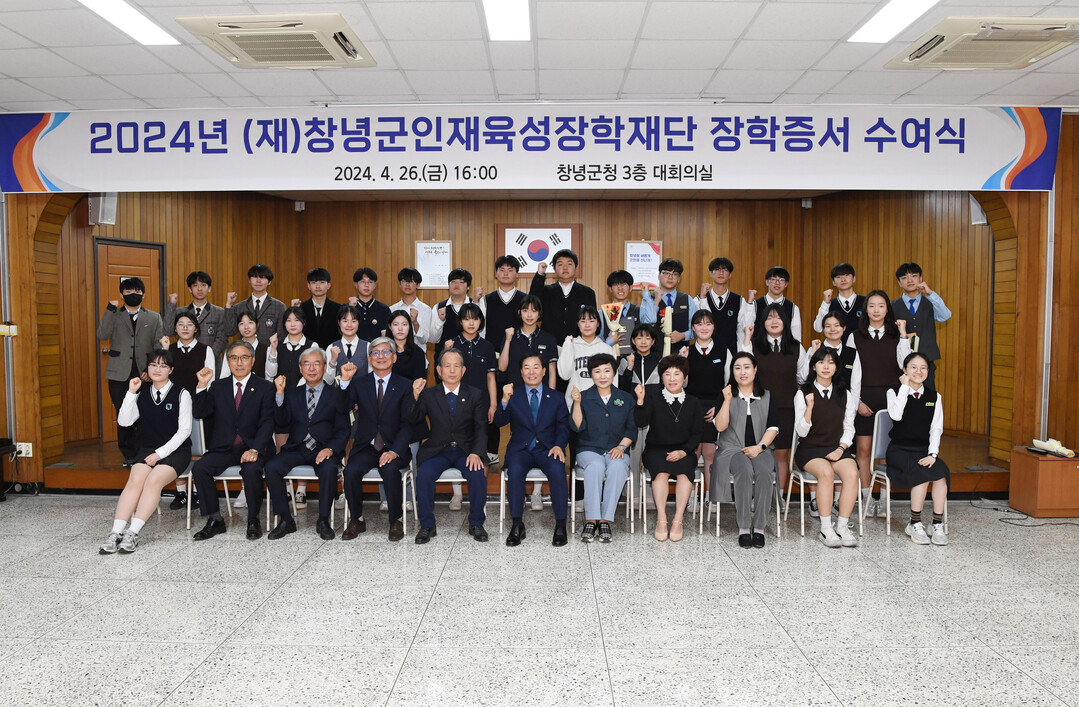 | ▲ 성낙인 군수가 지난해 4월26일 군청 회의실에서 대표 장학생 31명에 장학증서를 전달한 뒤 기념촬영을 하고 있다. [창녕군 제공] |