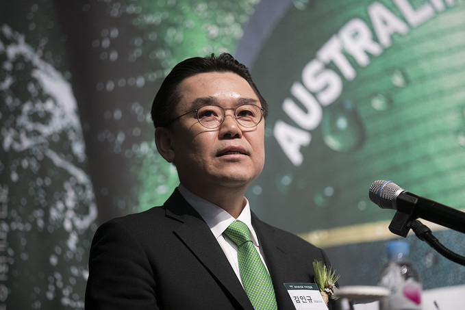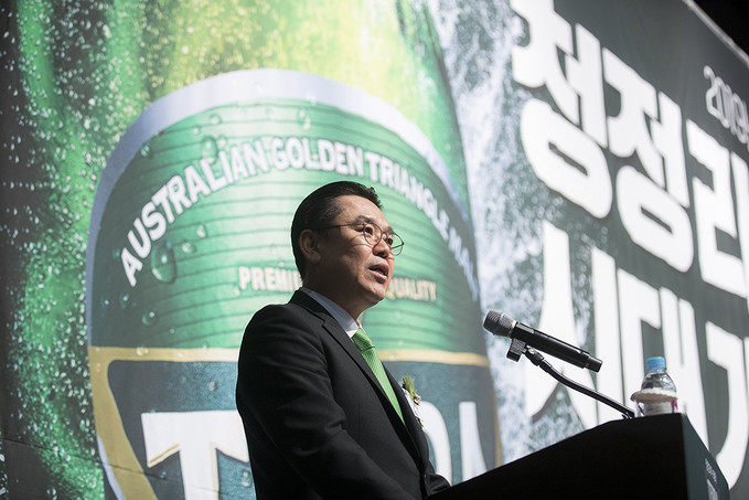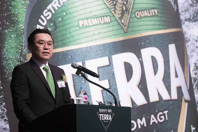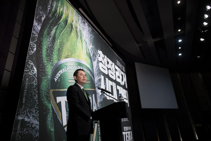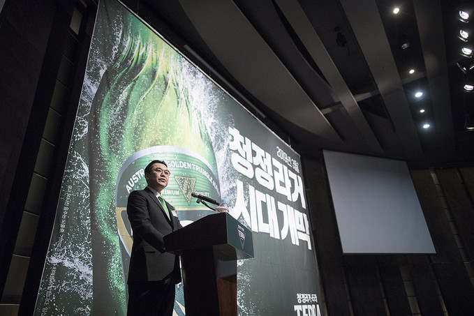 김인규 하이트진로 대표가 13일 오전 서울 중구 웨스틴조선호텔에서 열린 하이트진로 맥주 신제품 '테라' 출시 기자간담회에서 인사말을 하고 있다.