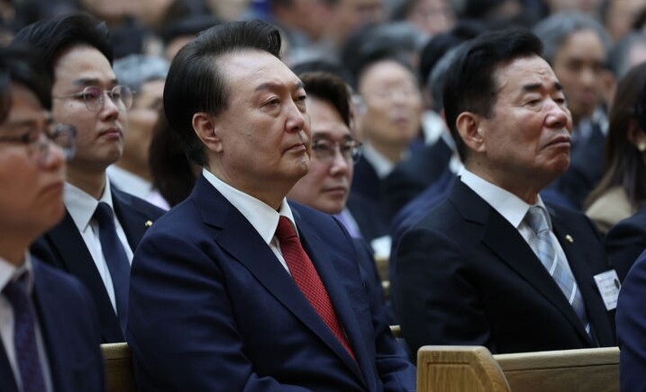 | ▲ 윤석열 대통령과 김진표 국회의장(오른쪽)이 부활절인 지난 3월 31일 서울 강동구 소재 명성교회에서 열린 '2024 한국교회부활절연합예배'에서 한교총 공동대표회장인 이철 목사 설교를 경청하고 있다. [뉴시스] |