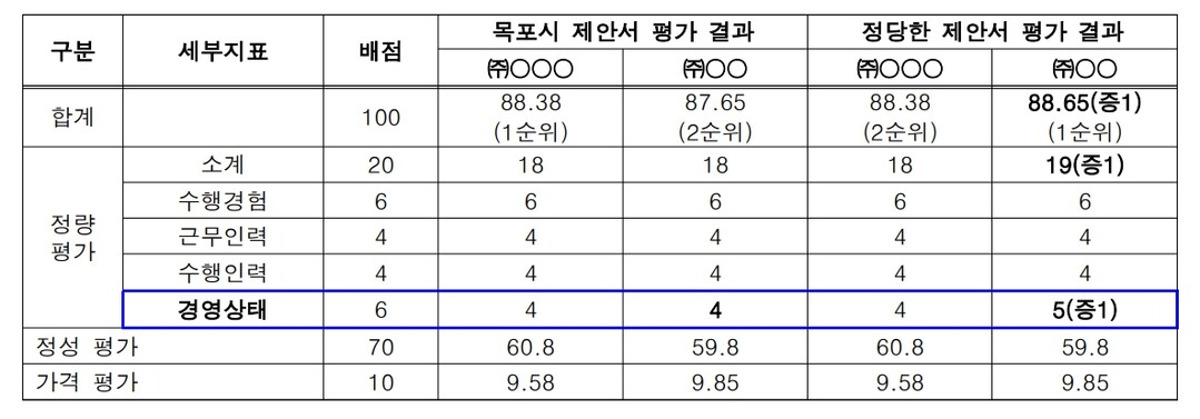 목포시는 B업체의 경우 신용평가등급확인서가 BB-로 배점기준상 5점을 부여해야 하지만, 4점으로 낮게 평가한 것이다.