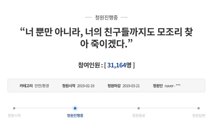 지난 19일 청와대 국민청원 게시판에 "너 뿐만 아니라, 너의 친구들까지도 모조리 찾아 죽이겠다"는 제목의 청원글이 올라왔다.