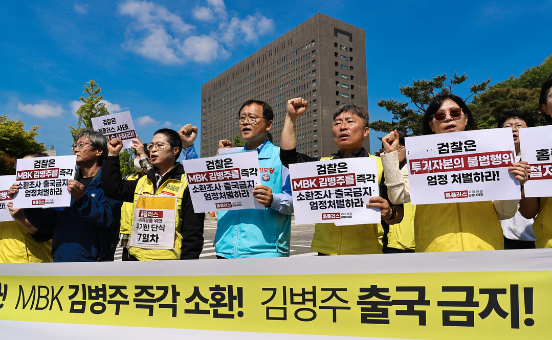 공동대책위원회는 이날 기자회견문을 통해 "김병주 회장은 실질 지배자로서 이번 사태의 핵심 주범임에도 불구하고 모습을 감추고 법적 책임을 회피하고 있다"며 "검찰은 김병주 회장을 즉각 소환하고 출국금지 조치를 취해야 한다"고 강력히 요구했다.