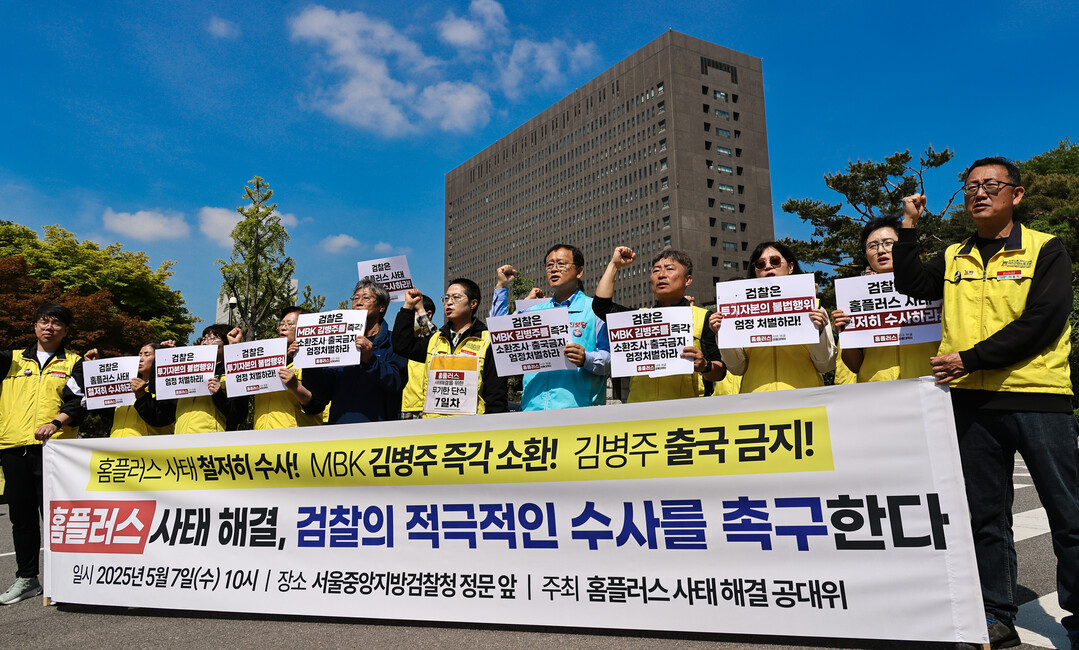 | ▲ 홈플러스 사태의 철저한 진상 규명과 MBK 김병주 회장의 즉각 소환을 촉구하는 기자회견이 7일 오전 서울 서초구서울중앙지검 정문 앞에서 열렸다.[이상훈 선임기자] |
