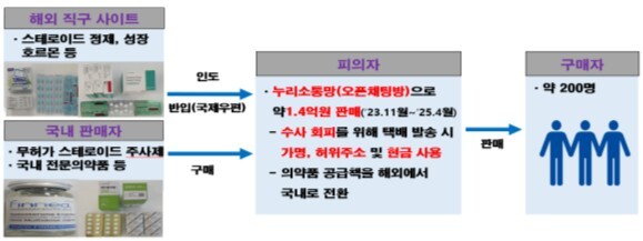 식약처는 국내에서 허가받지 않은 스테로이드 등이 SNS(누리소통망)을 통해 판매되는 사례를 확인하고 수사에 착수해 유통업자 A 씨가 과거 헬스트레이너로 일할 때 알게 된 해외직구 사이트 등 무허가 스테로이드 구매 경로 등을 이용해 이를 구매한 후 판매한 것으로 확인했다고 14일 밝혔다.