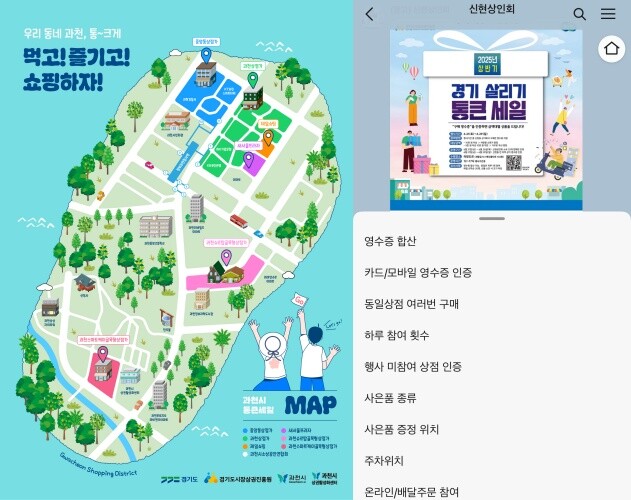 | ▲ 과천시 통큰세일 지도(왼쪽)와 신현상인회의 카카오톡 채널. [경상원 제공] |