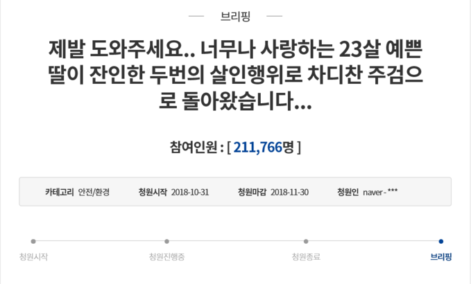 피해자 B씨의 부모는 청와대 국민청원 게시판에 "A씨의 범행은 치밀하게 계획적으로 이뤄졌다"며 "이런 살인마는 이 사회와 영원히 격리조치 될 수 있도록 강력한 처벌이 이뤄지도록 해달라"고 글을 올려 21만여명의 동의를 받아내기도 했다.