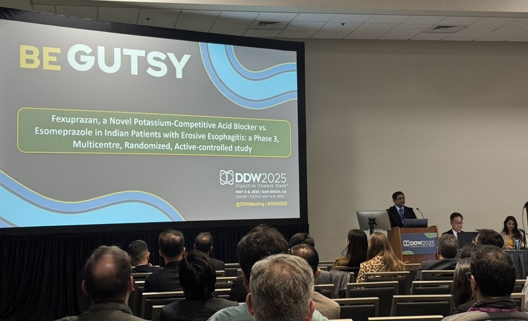 ▲ 프라빈 박사가 지난 6일(현지시간) 미국 샌디에이고에서 열린 '2025 미국소화기학회'에서 펙수클루 인도 3상 연구 결과를 발표하고 있다. [대웅제약 제공]