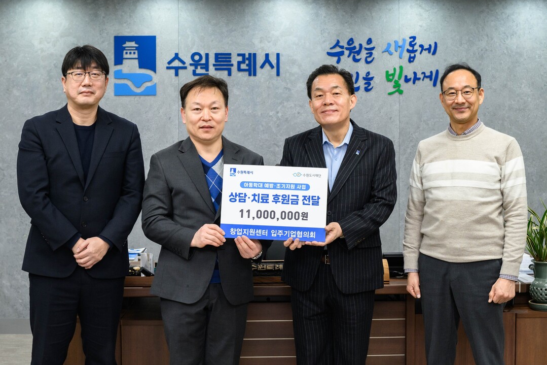 수원시 창업지원센터 입주기업협의회가 "학대 피해아동 지원에 사용해 달라"며 수원시에 후원금 1100만 원을 전달했다.