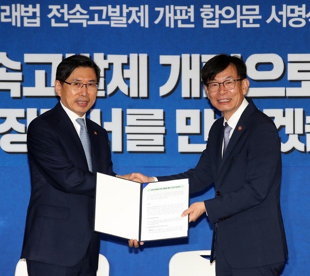 박상기 법무부 장관과 김상조 공정위원장은 21일 오전 광화문 정부중앙청사에서 이런 내용을 담은 '공정거래법 전속고발제 폐지 합의안'에 서명했다.