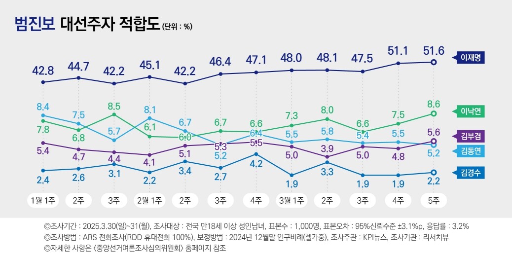 이 대표는 그러나 '범진보 대선주자 적합도' 조사에서 51.6%를 받아 상승세를 이어갔다.