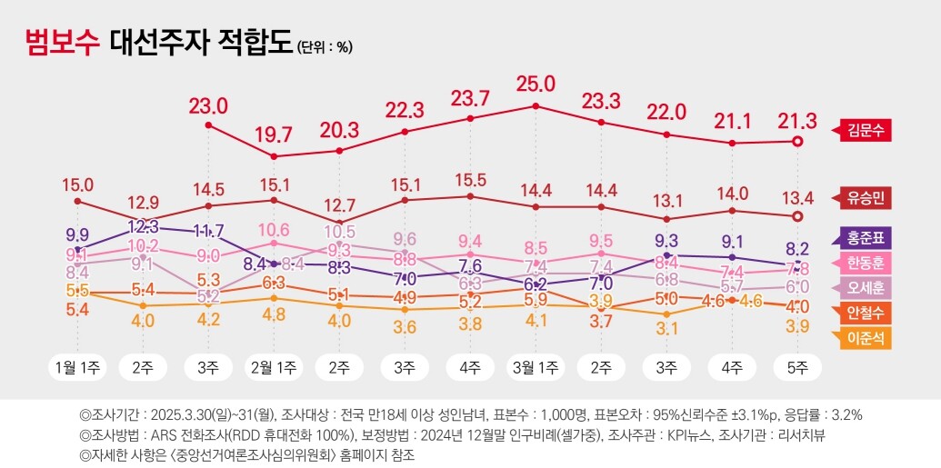 보수 적합도…김문수 21.3% 유승민 13.4% 홍준표 8.2% 한동훈 7.8%