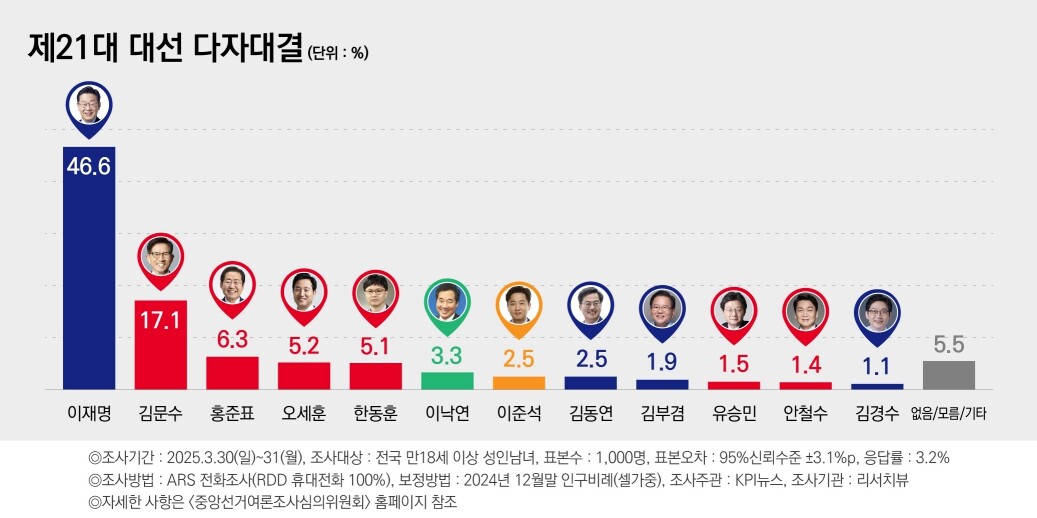 KPI뉴스가 리서치뷰에 의뢰해 지난달 30, 31일 전국 만 18세 이상 1000명을 대상으로 여론조사를 실시한 결과 이 대표는 다자대결 시 46.6%의 지지를 받으며 1위를 굳건히 지켰다. 김문수 고용노동부 장관은 17.1%로 뒤를 이었다.
