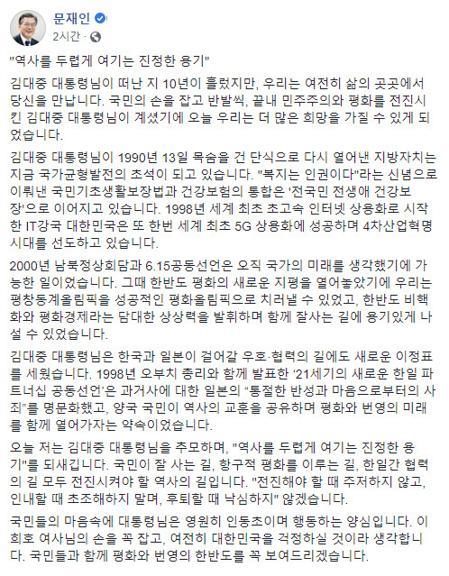 문 대통령은 "저는 김 전 대통령을 추모하며 '역사를 두렵게 여기는 진정한 용기'를 되새긴다"면서 "국민이 잘사는 길, 항구적 평화를 이루는 길, 한일 협력의 길 모두 전진시켜야 할 역사의 길"이라고 말했다.