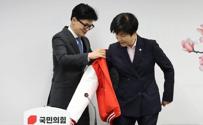 | ▲ 국민의힘 한동훈 비대위원장(왼쪽)이 4일 서울 여의도 중앙당사에서 입당한 김영주 국회부의장에게 당 점퍼를 입혀주고 있다. [뉴시스] |