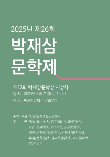 한국 서정시의 순수성과 향토적 정서를 빛낸 경남 사천 출신 시인 고(故) 박재삼의 문학세계를 기리는 제26회 박재삼문학제가 6월 20, 21일 이틀간 사천 박재삼문학관 일원에서 개최된다.